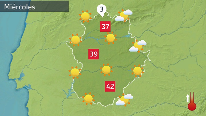 Valores en muchas comarcas esta mañana más de 2-3 y hasta 4 grados por encima de los de ayer. Y no solo en las mínimas, en las máximas también hablaremos esta tarde de ascensos. De una subida que nos llevará a temperaturas de más de 37-39 y hasta de 40 grados de nuevo en todas las comarcas e incluso a valores por encima de los 42 grados otra vez por algunas zonas bajas de la mitad sur, por comarcas como las de las Vegas del Guadiana,
