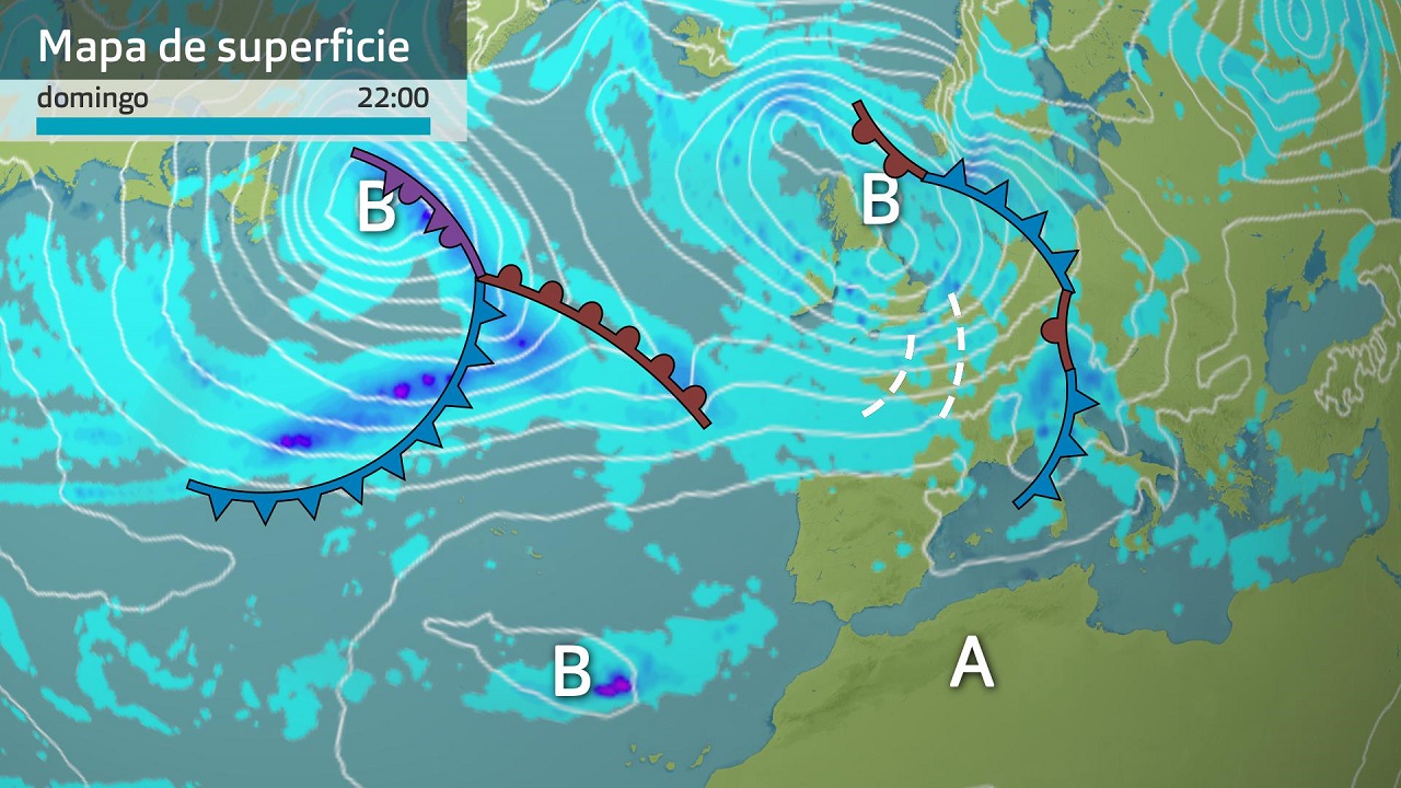 El frente avanzará durante la madrugada dejándonos todavía en la primera mitad del domingo algunas gotas puntuales.