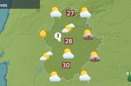Las que no bajarán tanto ya para esta tarde serán las máximas que incluso en el suroeste serán hoy un poquito más altas que las de ayer. Aunque este jueves volveremos a quedarnos alrededor o por debajo de los 27-30 grados en toda Extremadura.