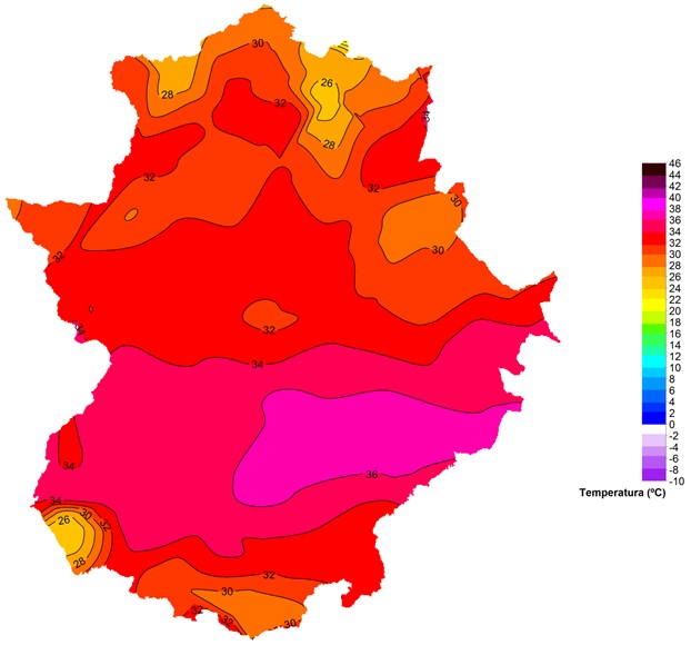 FIG. 6. Temperatura máxima alcanzada el 24 de mayo de 2020. Fuente: AEMET Extremadura
