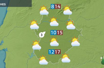 Las temperaturas máximas seguirán sin cambios. En general entre 14 y 17 grados, siendo las más altas en el suroeste de la región. Las mínimas sí descenderán entre 2 y 4 grados en todas las comarcas.