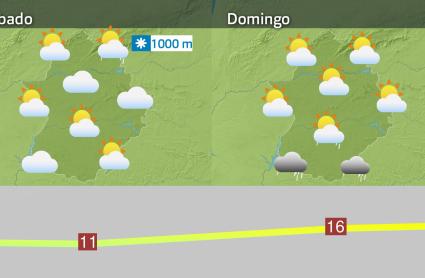 El aviso por nieve seguirá activado este sábado en el Sistema Central y con temperaturas mínimas alrededor de los -6 ºC en ese entorno por encima de los 900 metros. El domingo llegará otro frente, pero en esta ocasión afectará con lluvias más probables y concentradas en el sur de Badajoz. En el resto con muchas nubes y más ratos de sol hacia el norte. Ese día las temperaturas subirán entre 3 y 5 grados.