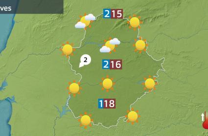 Esta situación se traduce en que las máximas podrán alcanzar con facilidad los 18 ºC en zonas como el Campo Arañuelo o las Vegas del Guadiana. Y superarán ya los 11 ºC en zonas más elevadas. Las mínimas seguirán por debajo de los 4 ºC en toda la región. El anticiclón y la noche despejada favorece este hecho. Cielo despejado con pocos parches de niebla al empezar el día en el Tajo y Guadiana.