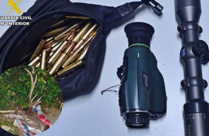 Tras el reconocimiento de las inmediaciones de tránsito por el camino, hallaron en la cuneta la cabeza de un ciervo y un rifle, que, analizado, presentaba la numeración de serie borrada de manera intencionada.