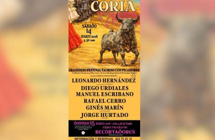 El festival taurino con picadores tendrá lugar el sábado 14 de marzo de 2026 a las 16:30 horas, con la participación del rejoneador Leonardo Hernández y los matadores Diego Urdiales, Manuel Escribano, Rafael Cerro y Ginés Marín, además del novillero cauriense Jorge Hurtado. Se lidiarán seis novillos-toros de la ganadería de Dª Carmen Valiente. La programación se completará el domingo 15 de marzo a las 17:00 horas con un espectáculo de recortadores.