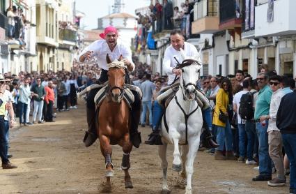 Dos personas montan a caballo durante Las Carreras de la Luz, en Arroyo de la Luz, Cáceres.
