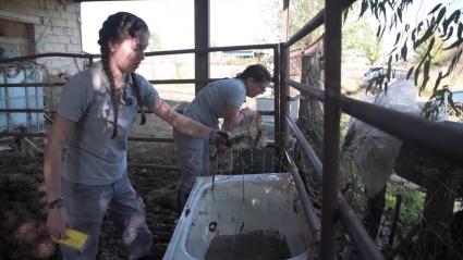 Isabel y Lidia limpian a fondo el bebedero de los chotos
