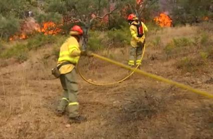 Éstas son las imágenes que acabamos de recibir desde Santa Cruz de Paniagua. Las ha grabado un equipo de Extremadura Noticias integrado por Delia Martín y Héctor Girón, codo a codo con los bomberos forestales que luchan por contener las llamas en las cercanías de esta población cacereña.