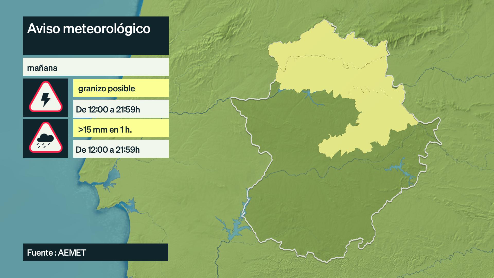 Con esta situación, este miércoles se activarán avisos de nivel amarillo para norte de Cáceres, Tajo y Alagón y Villuercas-Ibores y Montánchez, por lluvias que pueden ser intensas, con acumulados de más de 15 l/m2 en 1 hora, y tormentas, con posible granizo y rachas fuertes de viento. Desde las 12 de la mañana hasta las 10 de la noche.