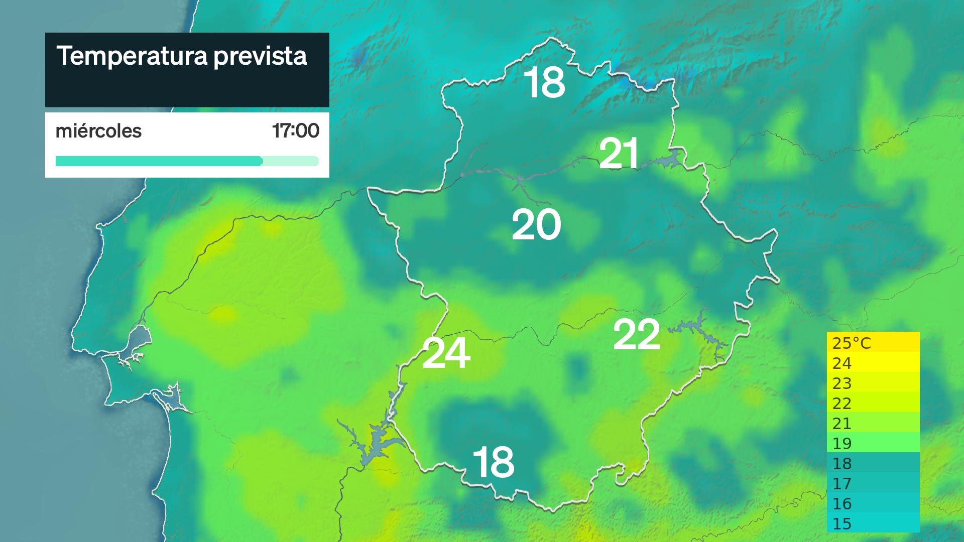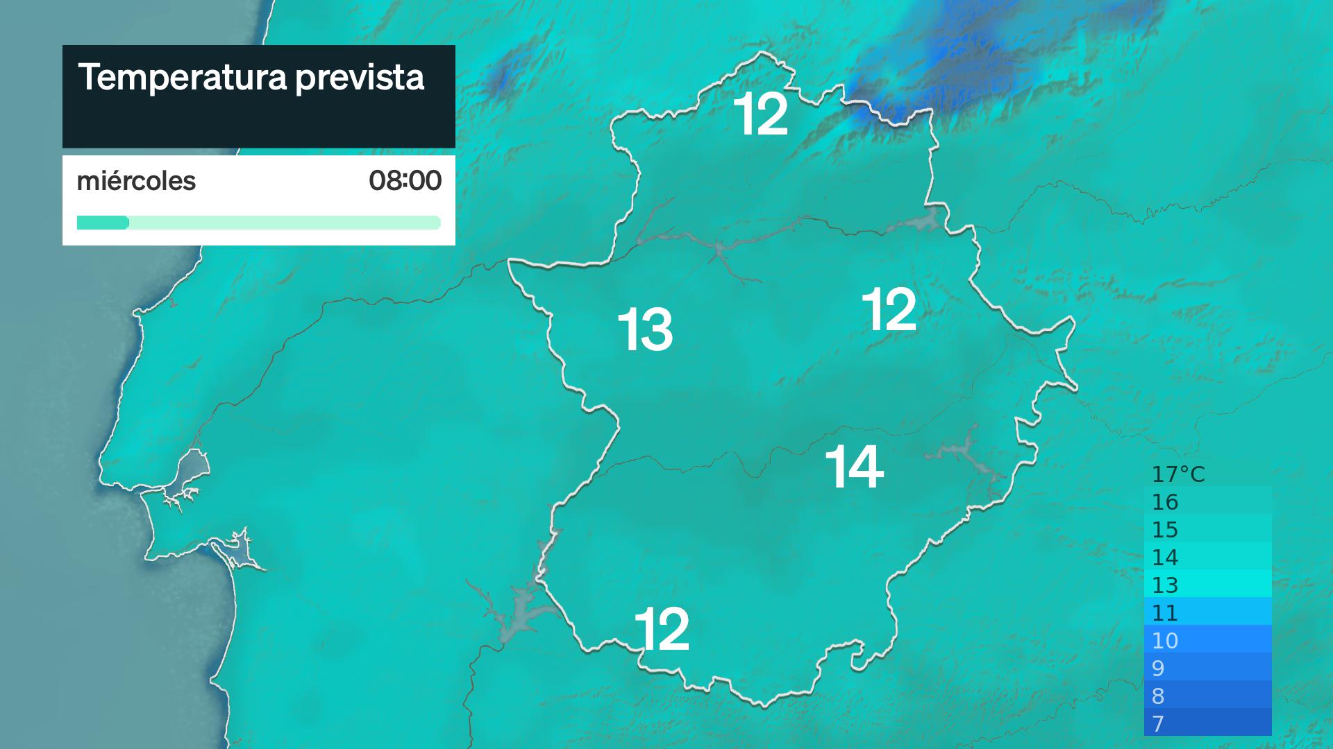 En cuanto a las temperaturas máximas, este miércoles nos costará llegar a los 25 grados, en las zonas donde más suba el termómetro, en las Vegas del Guadiana y en las comarcas del suroeste. En las zonas llanas las temperaturas alcanzarán los 20-22 grados, mientras que las sierras nos quedaremos por debajo de los 20.