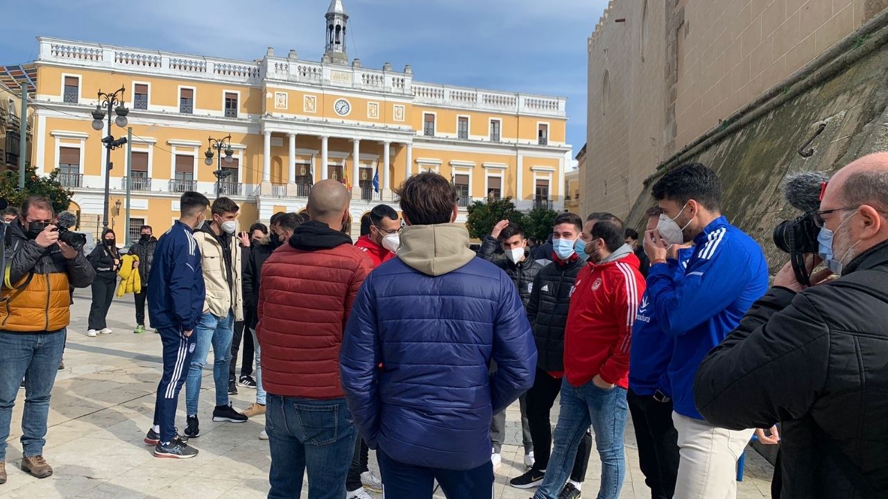 Plantilla, trabajadores y aficionados del CD Badajoz, se plantan en la Plaza de España
