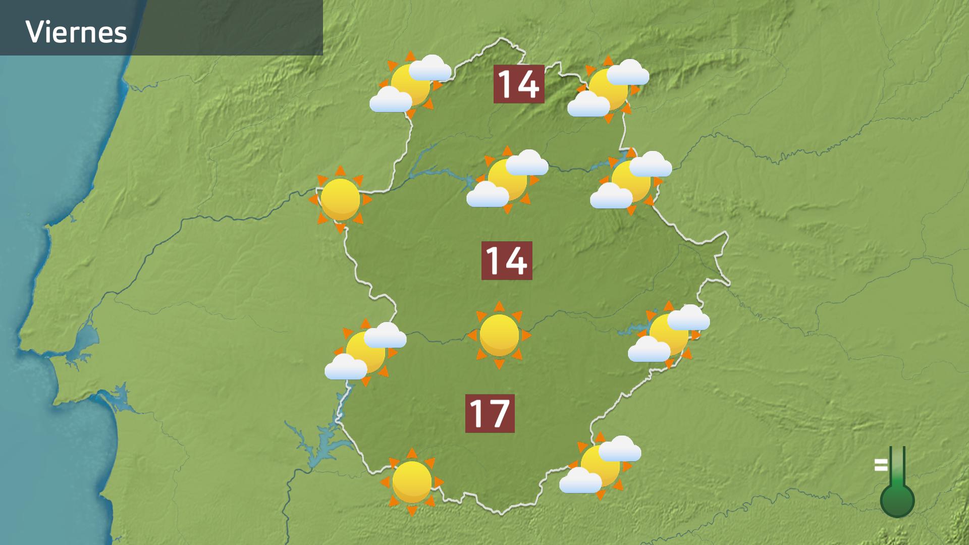 Para lo que resta de jornada llegarán más nubes de tipo alto desde el norte. Serán más abundantes en la provincia cacereña donde, incluso, podrán dejar los cielos velados. En cualquier caso, no dejarán precipitaciones. Las temperaturas, al igual que ayer, pasarán de los 15ºC en las vegas tanto del Tajo como del Guadiana. El viento soplará flojo de componente norte.