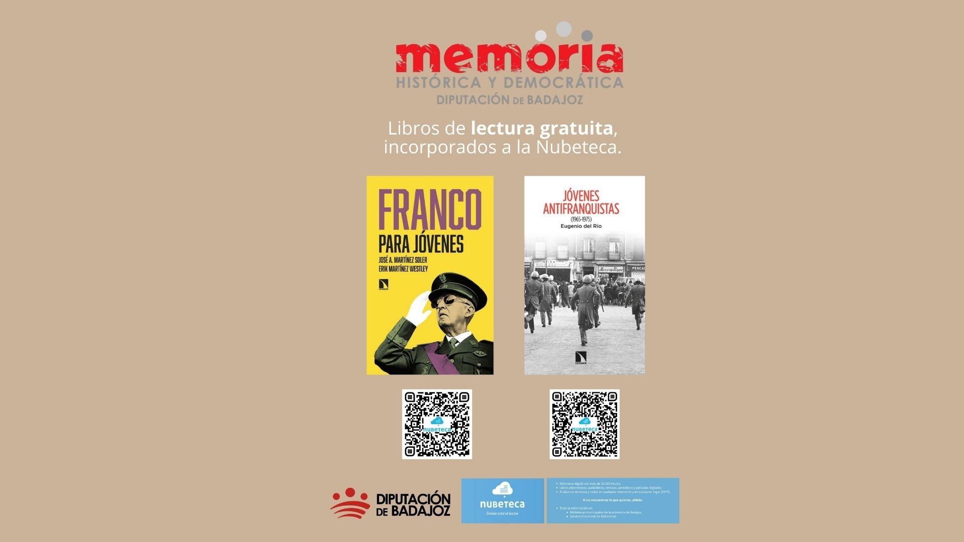 El proyecto estrella de la Diputación de Badajoz que ha logrado revitalizar la lectura, cuenta desde ya con dos títulos nuevos disponibles para ser disfrutados de forma gratuita. Nubeteca ha actualizado su catálogo con “Franco para jóvenes”, de José Antonio Martín Soler y Erik Martínez Westley, y “Jóvenes antifranquistas (1965-1975)”, de Eugenio del Río, libros que se enmarcan dentro de la labor de recuperación y reparación que la Institución provincial mantiene firme a través de su servicio de Memoria Histórica y Democrática.