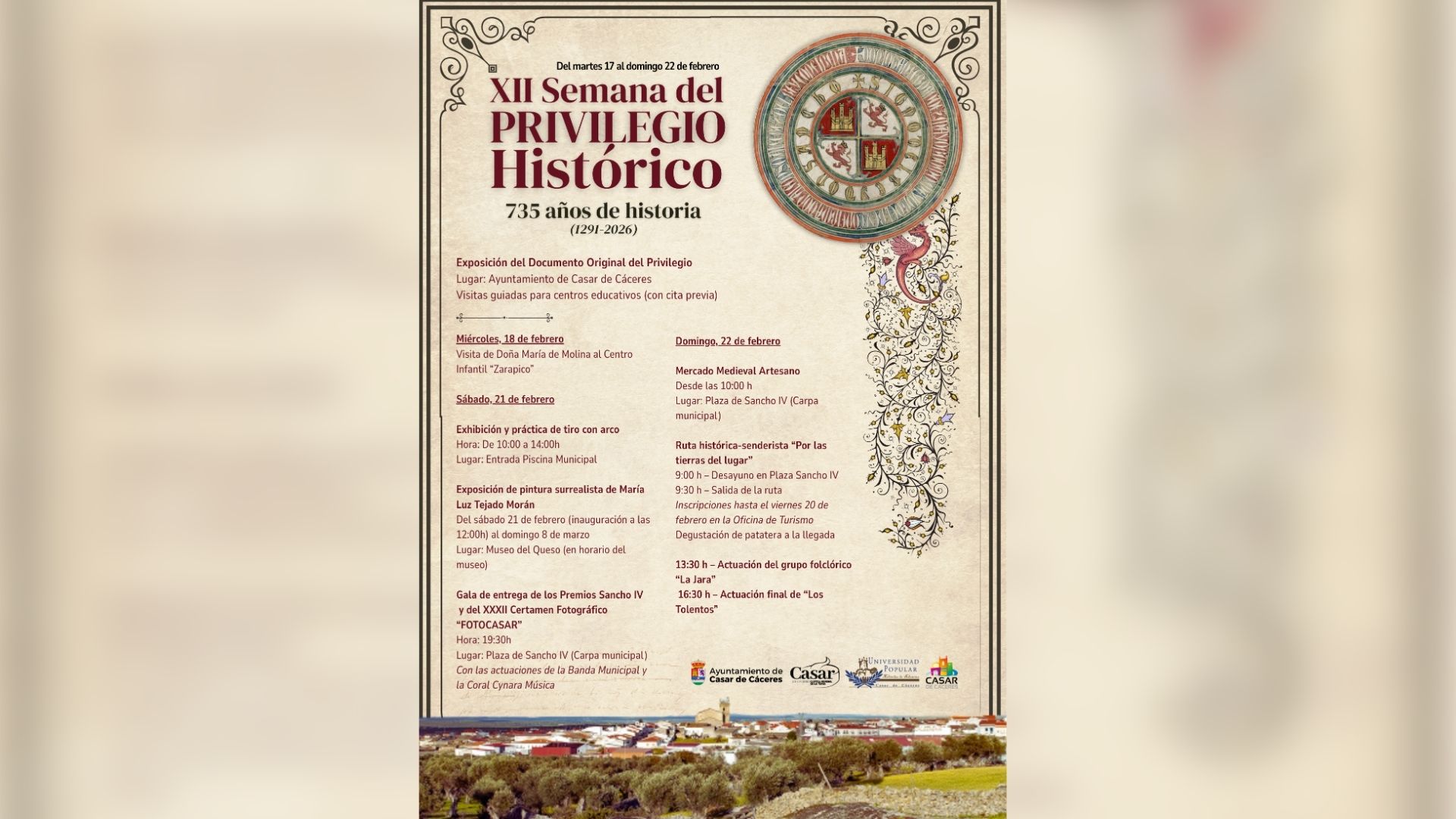 Casar de Cáceres conmemora del 17 al 22 de febrero de 2026 la XII Semana del Privilegio Histórico, una cita cultural y festiva que recuerda los 735 años de la concesión del Privilegio por el rey Sancho IV, otorgado el 18 de febrero de 1291 y ratificado posteriormente por Carlos IV.
