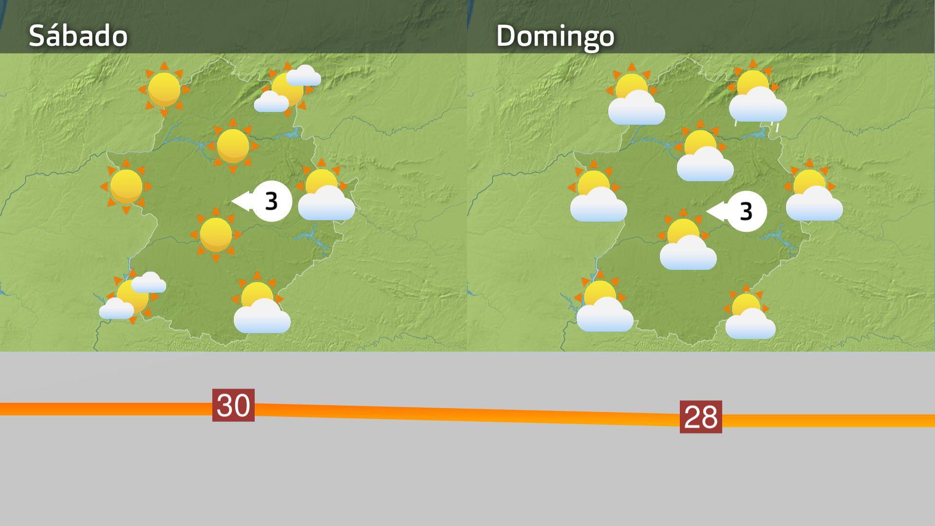 Esta situación dejará un sábado con cielo variable en las zonas de sierra sobre todo del este de la región. Se verán más por la tarde y serán cúmulos. También pueden aparecer en otros puntos, pero será en el resto un día despejado. El viento seguirá soplando del este en todas las comarcas. Pero sobre todo en las centrales volverá a superar los 30 km/h. Durante el domingo pueden aparecer algunos chubascos esporádicos en Gredos y hacia el centro de la región.