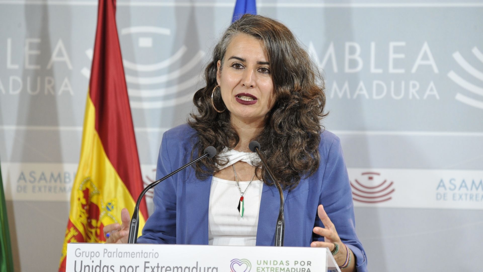 Imagen de Archivo. Irene de Miguel, líder de Unidas por Extremadura, durante una comparecencia en la sala de prensa de la Asamblea.