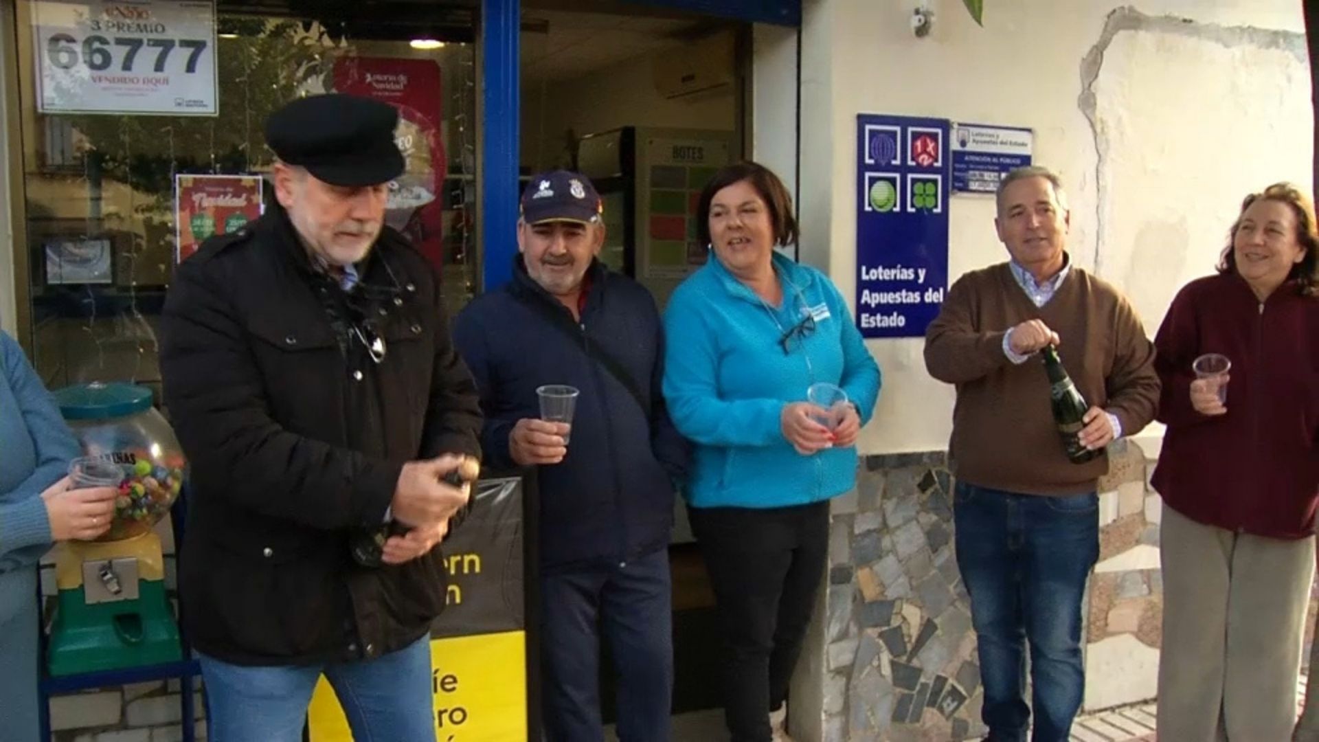 Vecinos de Talavera la Real celebrando el tercer premio vendido en la administración de esta localidad.
