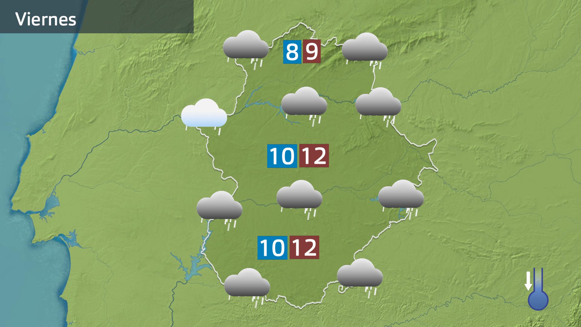 Así, ya esta noche y madrugada esperamos los primeros chaparrones por el oeste cacereño. Unas lluvias que se irán extendiendo al resto de la región en el primer tramo de la mañana y que aguantarán por la tarde. Jornada, por tanto, pasada por agua en Extremadura. Las temperaturas se mantendrán sin demasiadas variaciones. Las mínimas se quedarán entre los 8-10ºC y las máximas entre los 10-12.