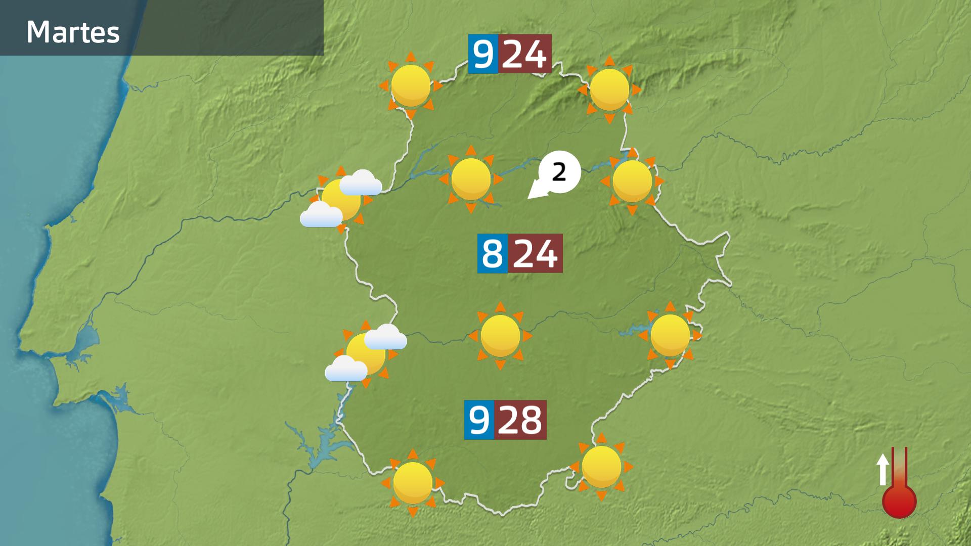 Todo con ambiente despejado y alguna nubes alta asomando por la tarde hacia el oeste de la región. Las máximas empiezan a subir pero será poco apreciable. Sí llegaremos en más de una localidad del suroeste hasta los 28 ºC. En el resto por debajo de los 26 ºc, y no pasaremos de los 22 ºC en zonas más altas de sierra.
