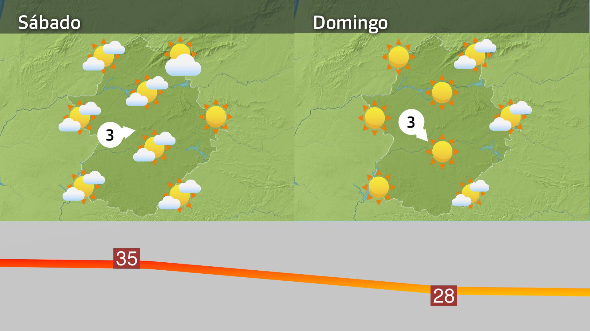 Este sábado todavía no se notará mucho el descenso de las temperaturas máximas, pues bajarán entre 1 y 2 grados y más concretamente en el norte y este de Cáceres. En el resto se mantendrán sin cambios, aunque la sensación será diferente a la de hoy debido a no tener tantas nubes y tanta humedad. Será de menos bochorno.