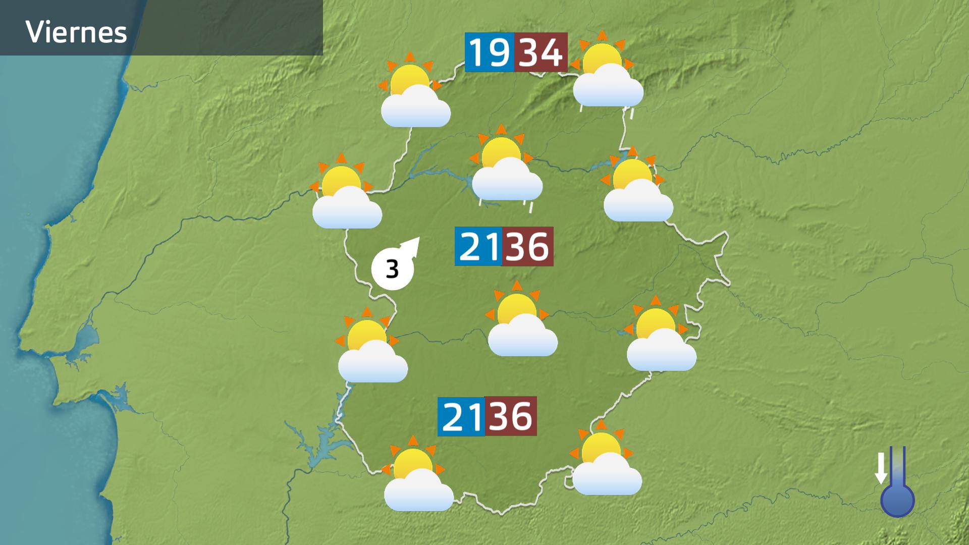 Bajan las temperaturas diurnas, pero todavía alcanzaremos los 36 ºC en algunas zonas más bajas del centro y este de la región. Ya no subiremos de los 34 ºC en zonas del norte de Cáceres y sr de Badajoz, y los avisos se activarán de nuevo en las Vegas del Guadiana y Villuercas.