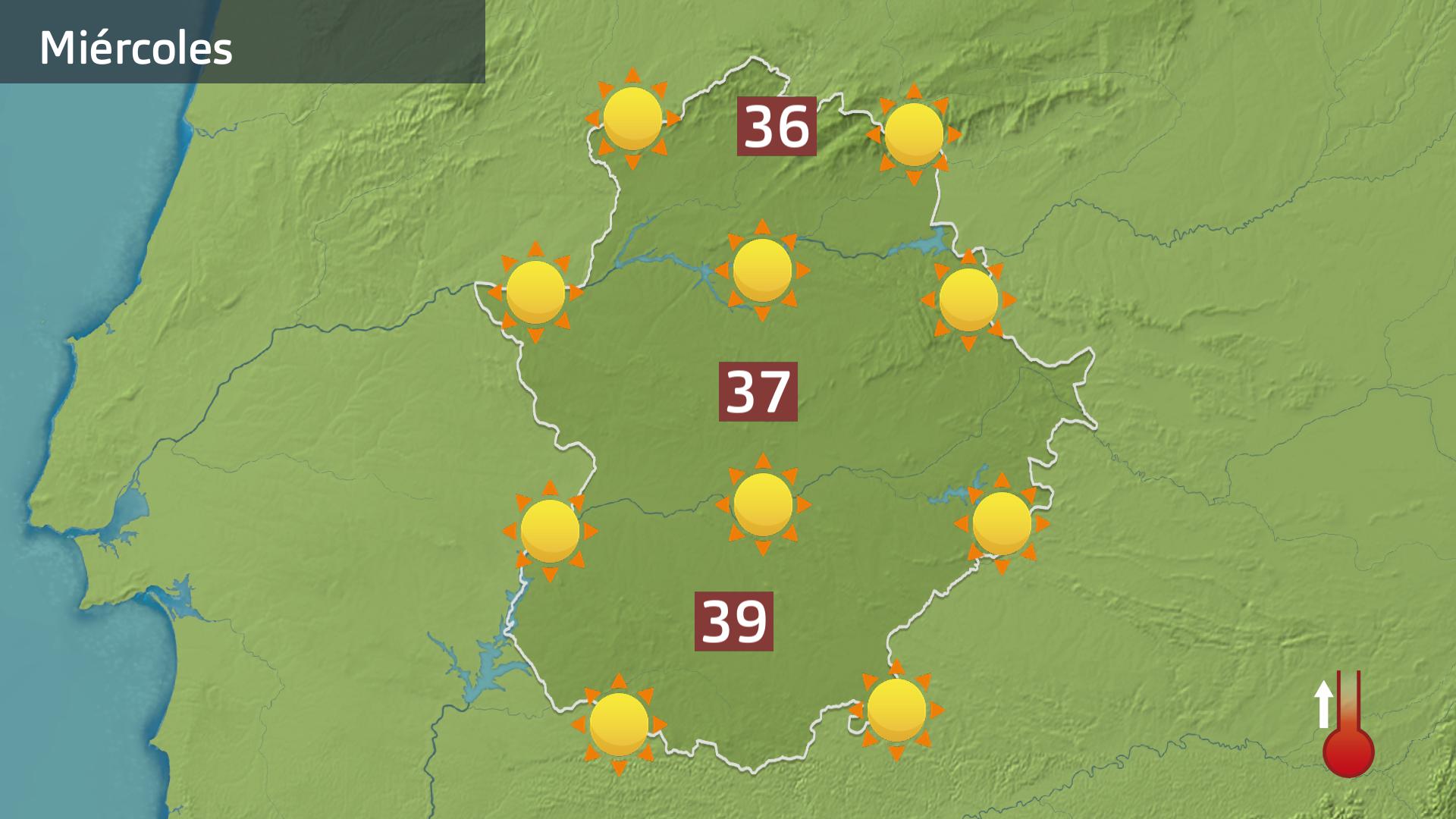 Unas máximas que por segundo día consecutivo activarán los avisos amarillos por altas temperaturas en las mismas zonas que ayer: Vegas del Guadiana, Llanos de Olivenza y Baldíos, por todo el tercio norte y en Montánchez y Villuercas-Ibores. Precaución.