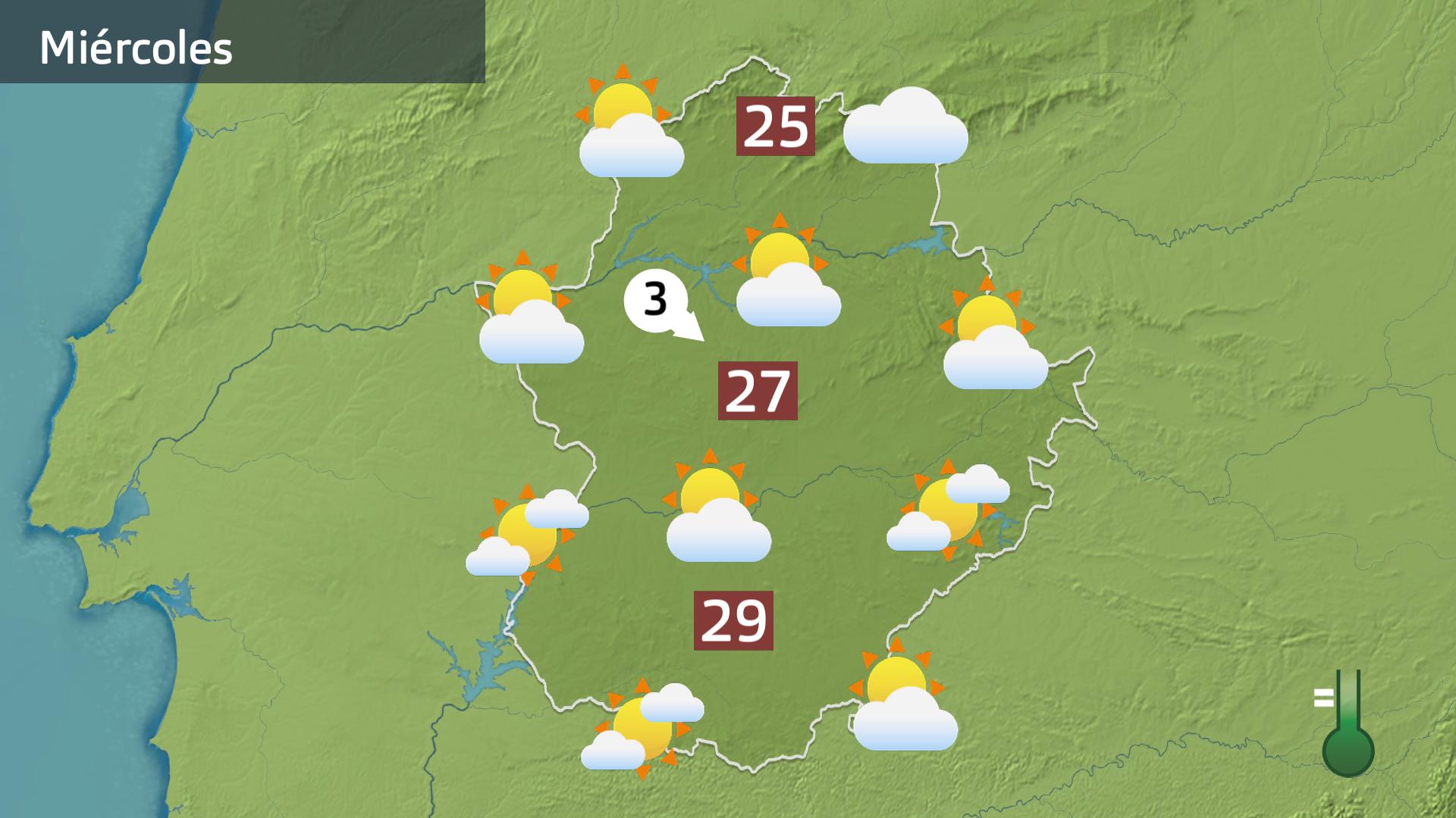 De hecho en el tramo central del día de lo que hablaremos será de cielo algo nuboso incluso ya en todas las comarcas, con nubes algo más compactas por el norte por donde no descartamos, en zonas de sierra sobre todo: por la parte alta del Valle del Jerte, de la Vera o del Ambroz incluso y en menor medida en las Hurdes que aparezcan incluso algunas precipitaciones.