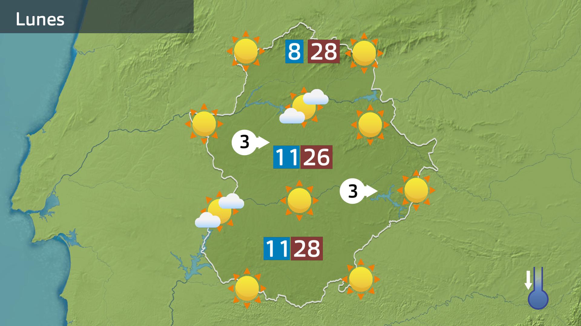 Así, el lunes comenzará con ambiente fresco (e incluso frío) en la comunidad. En las hondonadas del norte, del este y del sur no se descarta que bajemos de los 10ºC; en el resto, bajaremos de los 15. Las máximas bajarán un poco más, sobre todo en las comarcas del este. Registros máximos que, como hoy, apenas llegarán a los 30. En cuanto al estado del cielo, se mantendrán los grandes ratos de sol, aunque llegarán algunas nubes altas por la tarde. El viento será del noroeste.