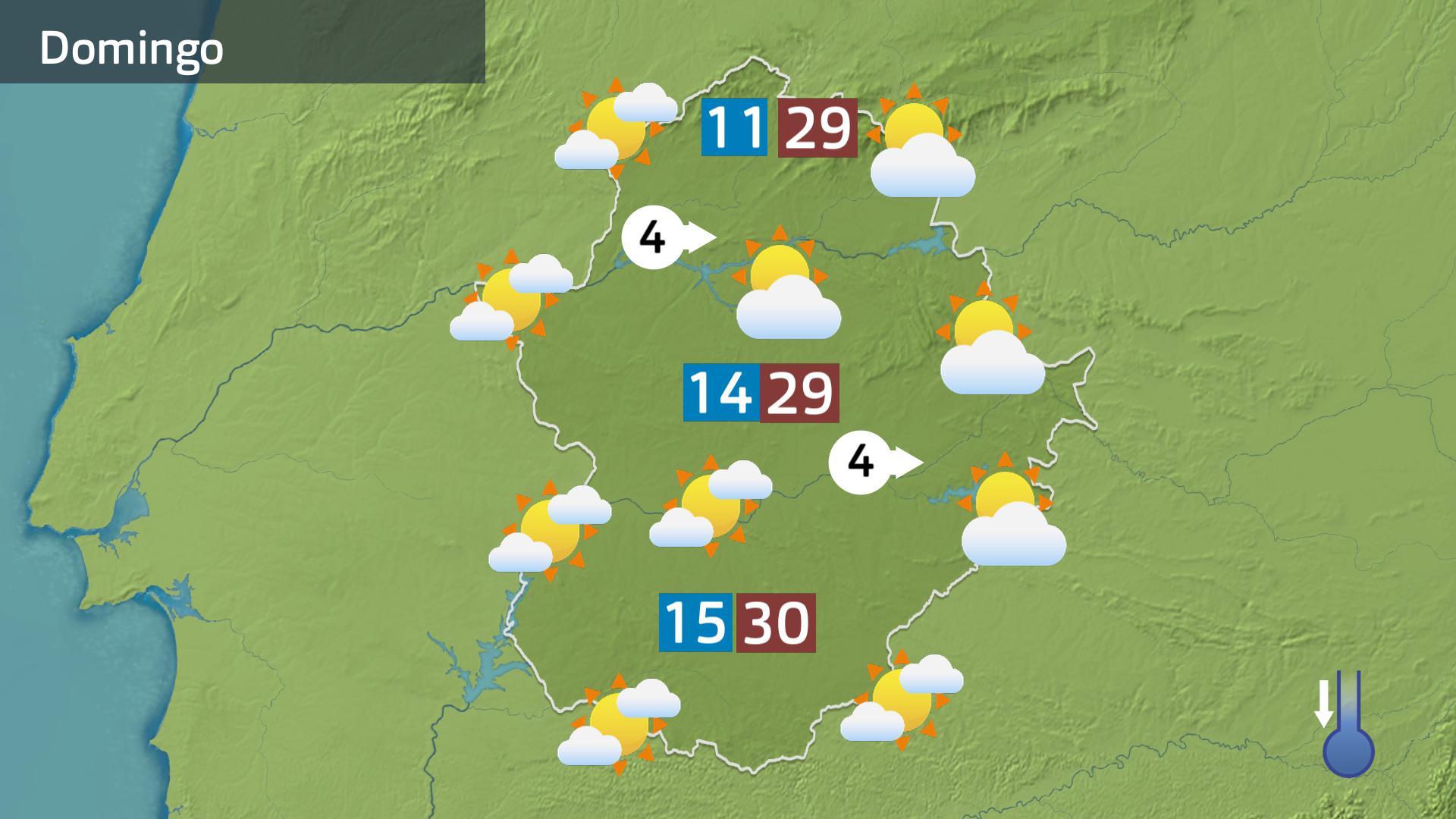 Así, el domingo comenzará con ambiente fresco en toda la comunidad. Los termómetros caerán de los 15ºC en gran parte de los municipios extremeños. Las máximas, en cambio, experimentarán un descenso. Bajada de 3 a 5ºC que hará que los registros no lleguen a los 30 en general; e incluso en las cumbres no parece que lleguemos a los 25. El viento del oeste cogerá cogerá fuerza después del mediodía, acentuando la sensación de fresco. En cuanto a los cielos, será un día de nubes en la región, sobre todo en la mitad norte. Irán avanzando de oeste a este a lo largo del día.