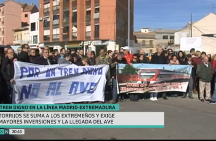 La vecina localidad manchega de Torrijos ha levantado hoy la voz por un tren digno, mayores inversiones y la llegada del AVE. Unas 150 personas han salido a la calle para pedir mejoras en la línea ferroviaria Madrid-Extremadura. Dos regiones que sufren las mismas averías e incidentes y que se han unido para pedir mayores inversiones.