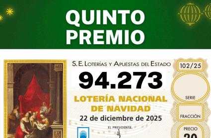 El número 94.273 ha sido agraciado con uno de los quintos premios del Sorteo Extraordinario de la Lotería de Navidad, dotado con 60.000 euros por serie (6.000 euros al décimo). En esta ocasión, el premio ha quedado concentrado en Aragón y la Comunidad de Madrid, sin tocar Extremadura.