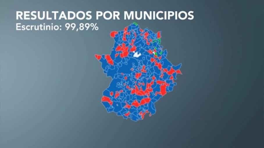 En las grandes ciudades prima el color azul de los populares; el segundo puesto se mantiene en el rojo socialista, en Cáceres, Mérida, Plasencia o Don Benito, pero a poca distancia le sigue Vox, que gana electores frente a los que pierde el PSOE en masa.