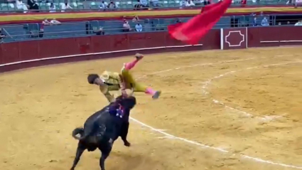 Ocurrió en el tercer novillo de la tarde, cuando Manuel Perera entró a matar. El animal del Freixo, la ganadería que El Juli tiene en Olivenza, prendió de lleno la parte baja del vientre del novillero, al que levantó y lo lanzó contra la arena.
