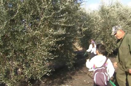 Entre olivos y capazos, los niños han practicado la técnica del "ordeño" del olivar, recogiendo las aceitunas con las manos "una a una", como se hacía antiguamente, antes de poner en marcha los métodos modernos de los "vibradores automáticos".