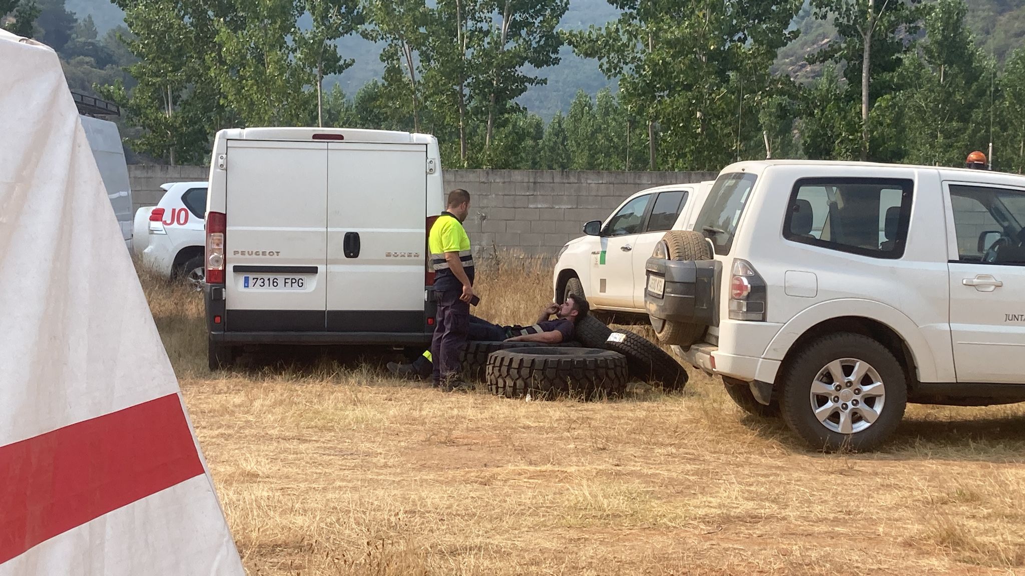 Efectivos que participan en las labores de extinción descansan en el puesto de mando único (Delia Martín)