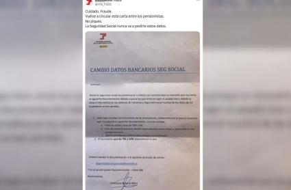 La Tesorería General de la Seguridad Social (TGSS) ha alertado sobre la reaparición de una carta fraudulenta dirigida a pensionistas con el objetivo de obtener de forma ilícita sus datos personales y bancarios. Así lo ha advertido el organismo a través de un mensaje difundido en redes sociales, en el que pide máxima precaución a la ciudadanía.