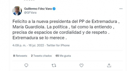 María Guardiola señala que el encuentro con el residente de la Junta, Guillermo Fernández Vara, fue amable y cordial por ambas partes: "Pediría al presidente que no se enfade. Lo que fui es muy sincera, lo que le dije al presidente en su despacho lo quise compartir con los medios de comunicación también. Creo que el reloj se ha parado, al reloj se le ha parado la pila y los extremeños no quieren cambiar la pila, quieren cambiar el reloj, por un reloj que funcione".