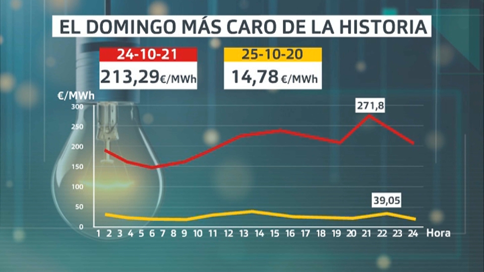 Una cantidad desorbitada si la comparamos con lo que pagamos hace un año. En el cuarto domingo de octubre de 2020, la media no llegó a los 15 euros por megavatio. Hoy pagamos 14 veces más y parece ser que la situación se sigue complicando. El lunes 25 de octubre el precio vuelve a subir y octubre ya va camino de convertirse también, en el mes más caro de la historia.