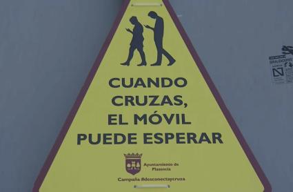 Miramos el móvil constantemente, incluso al cruzar la calle o la carretera, sin ser conscientes del riesgo que conlleva. Desde hoy, en Plasencia hay veinte señales advirtiendo del peligro que supone cruzar la vía utilizando el teléfono móvil.