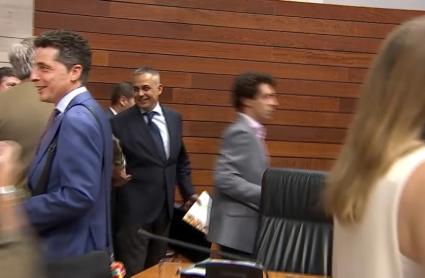 Los cinco diputados de Vox se han dirigido directamente a sus escaños, y en su camino solamente se ha producido un apretón de manos de Gordillo con su hasta ahora consejero, Ignacio Higuero.