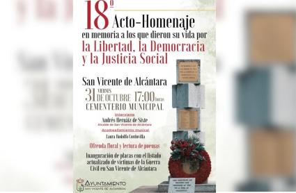 Víctimas de la Guerra Civil y la represión franquista recibirán el próximo viernes, día 31, en el cementerio municipal de la localidad pacense de San Vicente de Alcántara, un homenaje, a las 17,00 horas.