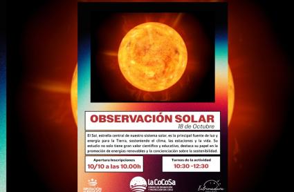 La Diputación de Badajoz, a través del Área de Transición Ecológica, celebrará el próximo sábado 18 de octubre una nueva actividad de observación astronómica en la finca La Cocosa, dedicada en esta ocasión al Sol, el astro que hace posible la vida en la Tierra y protagonista de la astronomía diurna.
