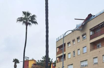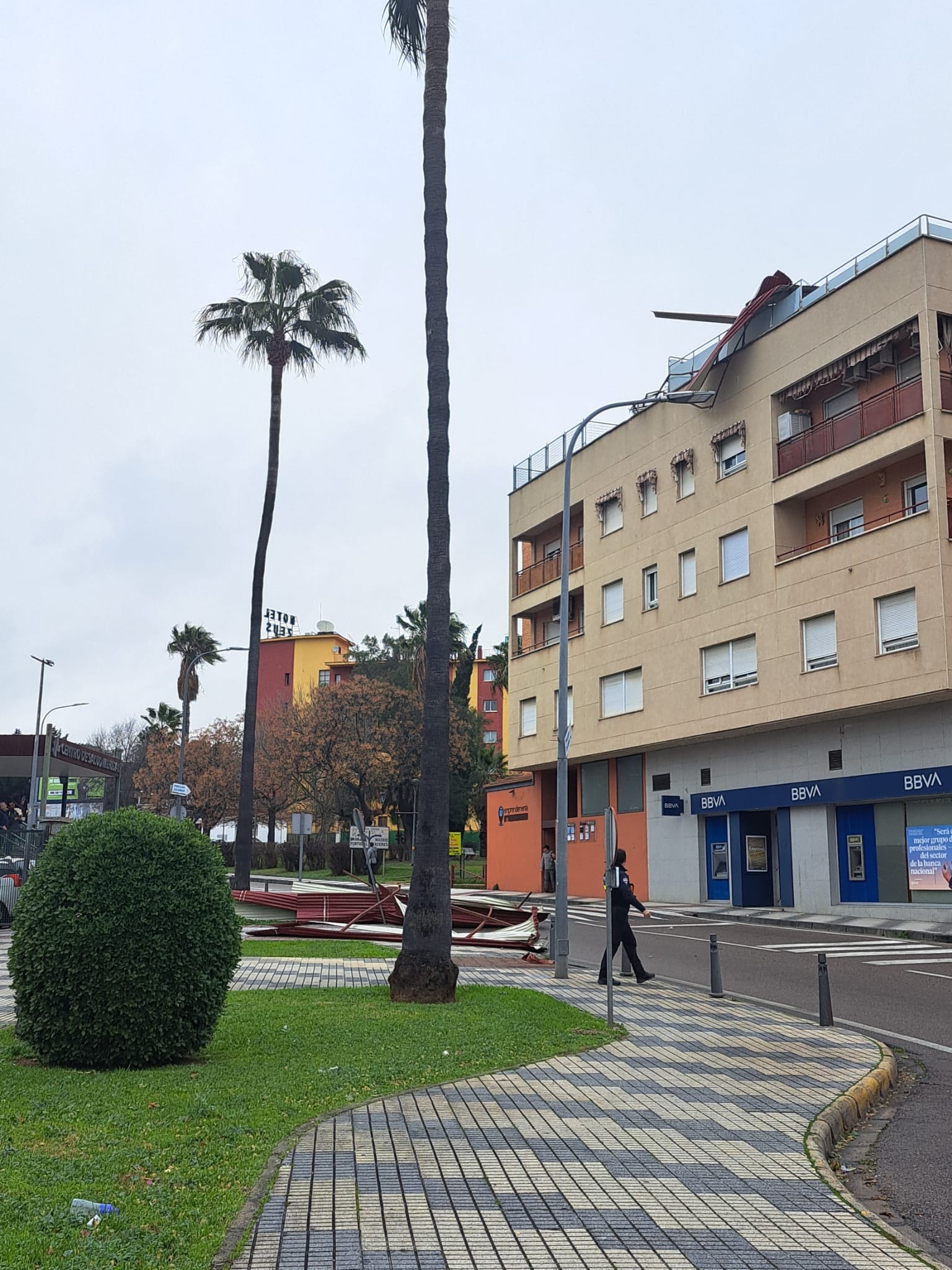 Una chapa de grandes dimensiones se desprende por el viento y cae en plena calle Vicente Aleixandre, a la altura del Centro de Salud Mérida Urbano III, sin causar daños personales. La chapa ha volado desde el mismo Centro de Salud, cayendo restos en la calle y llegado incluso al edificio de enfrente. Los Bomberos están trabajando en el lugar para determinar los daños ocasionados y la Policía Local ha cortado el tráfico de la vía.