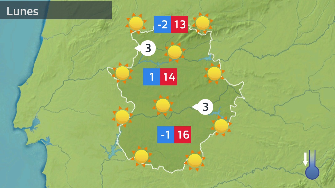 Así el lunes será otro día estable en Extremadura. Quizás por la mañana se puedan colar algunas nubes altas por las comarcas del norte, poca cosa. Claro dominio de los cielos despejados en las dos provincias, con heladas a primeras horas. La tarde se presenta más fresca, puesto que siguen a la baja las temperaturas máximas. El viento será del este.