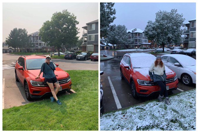 ¿Os imagináis estar una tarde tomando el sol con unos más que confortables 34 grados en los termómetros y a la mañana siguiente, cuando os levantáis tener que poneros la ropa de invierno? Eso es lo que le ha pasado a Laura Carretero, una extremeña de Burguillos del Cerro que vive en Denver, Colorado (Estados Unidos) y que nos ha hecho llegar esta imagen.