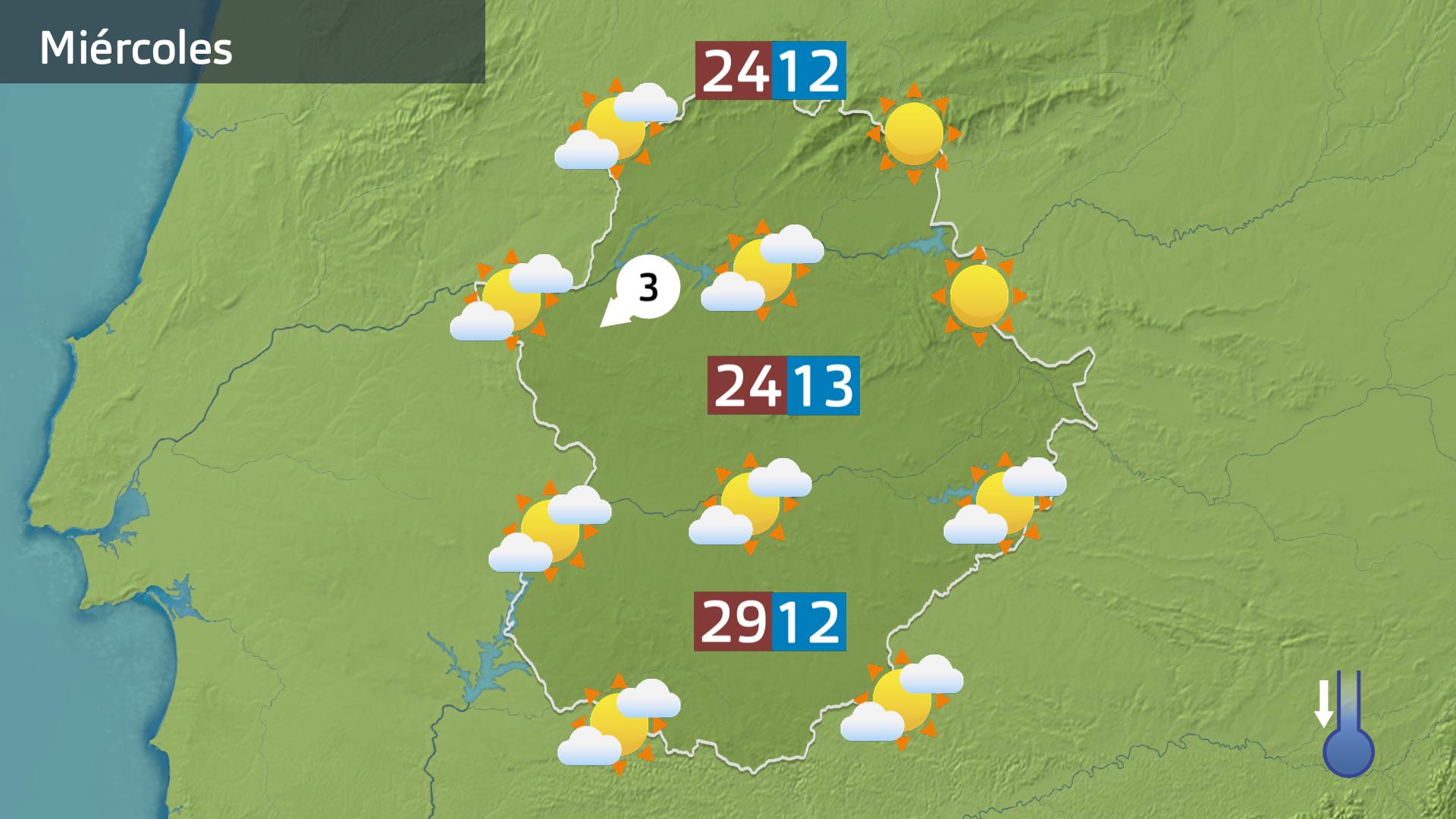 En Extremadura, las temperaturas descenderán este miércoles en las comarcas cacereñas. Será donde más se note. Aunque la sensación ya no será de tanto calor de forma general. En la mitad norte de la región bajarán entre 2 y 4 grados, así que estaremos como mucho ya en los 25 ºC, que se alcanzarán en el valle del Tajo. En las comarcas pacenses prácticamente no se notará la bajada.