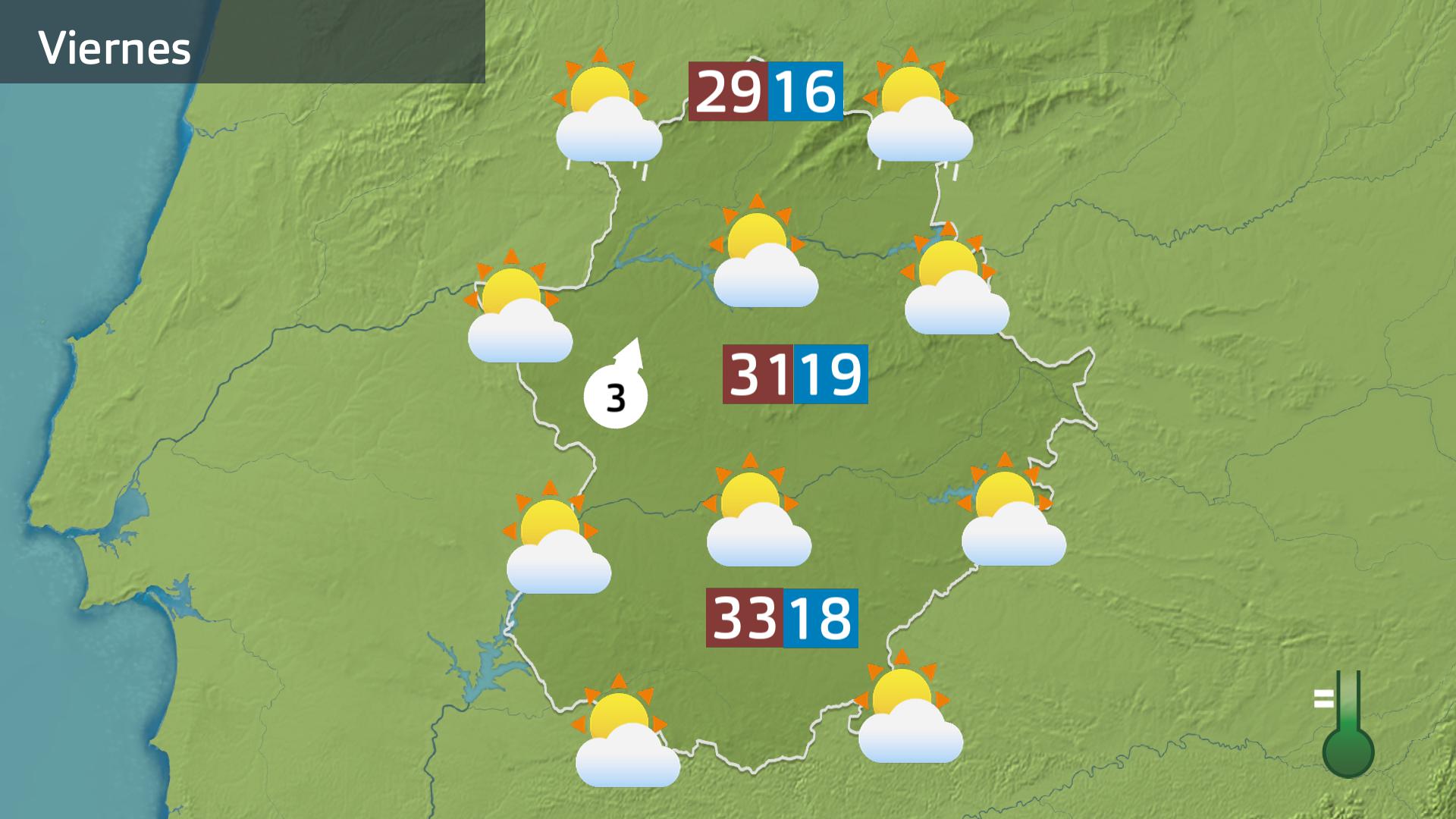 Tendremos cielo variable durante toda la jornada, con viento que por la tarde soplará ligeramente más fuerte de componente suroeste. En cuanto a las temperaturas estarán entre los 29 ºC en zonas medias y bajas de sierra, y los 33 grados, que serán las más altas en las Vegas del Guadiana y algunas localidades del este pacense.