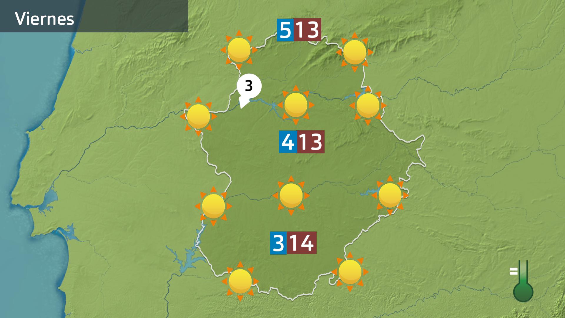 En cuanto a las temperaturas, no sufrirán grandes cambios, excepto las mínimas que tenderán a descender de forma ligera. Próximas a las heladas en zonas altas de montaña y algunas localidades del sureste pacense, en el resto se quedarán entre los 2 y 5 grados. Las máximas no variarán de forma significativa.