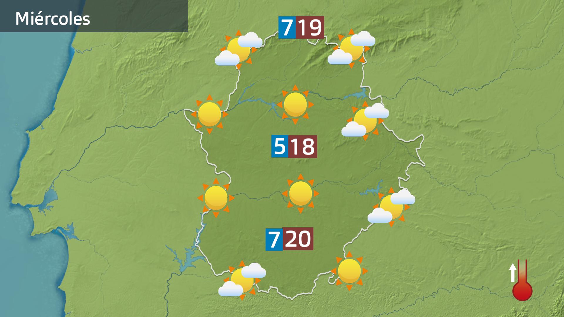 Este miércoles notaremos más estabilidad aún. Por un lado, el cielo estará despejado en la práctica totalidad de la región. Solamente tendremos algunos parches de nieblas en algunas zonas del Guadiana y del Tajo. Ambiente despejado con nubes de evolución menos extendidas. Aparecerán con más probabilidad en el Sistema Central, hacia Villuercas y este y sur de Badajoz.