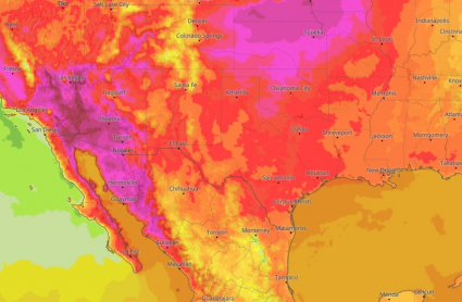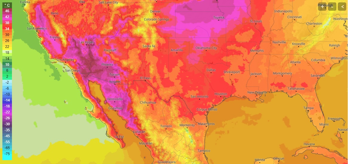 Ya en la jornada de hoy, jueves, se superan los 38ºC en amplias zonas del suroeste de Estados Unidos y del norte Méjico. Pero esto sólo es el aperitivo ya que seguirán subiendo durante lo que queda de semana. De hecho, se esperan temperaturas máximas de 47ºC en Las Vegas y superiores a los 50 en puntos de Nevada y de Arizona. Es muy probable que caigan récords correspondientes al mes de junio en estos estados.